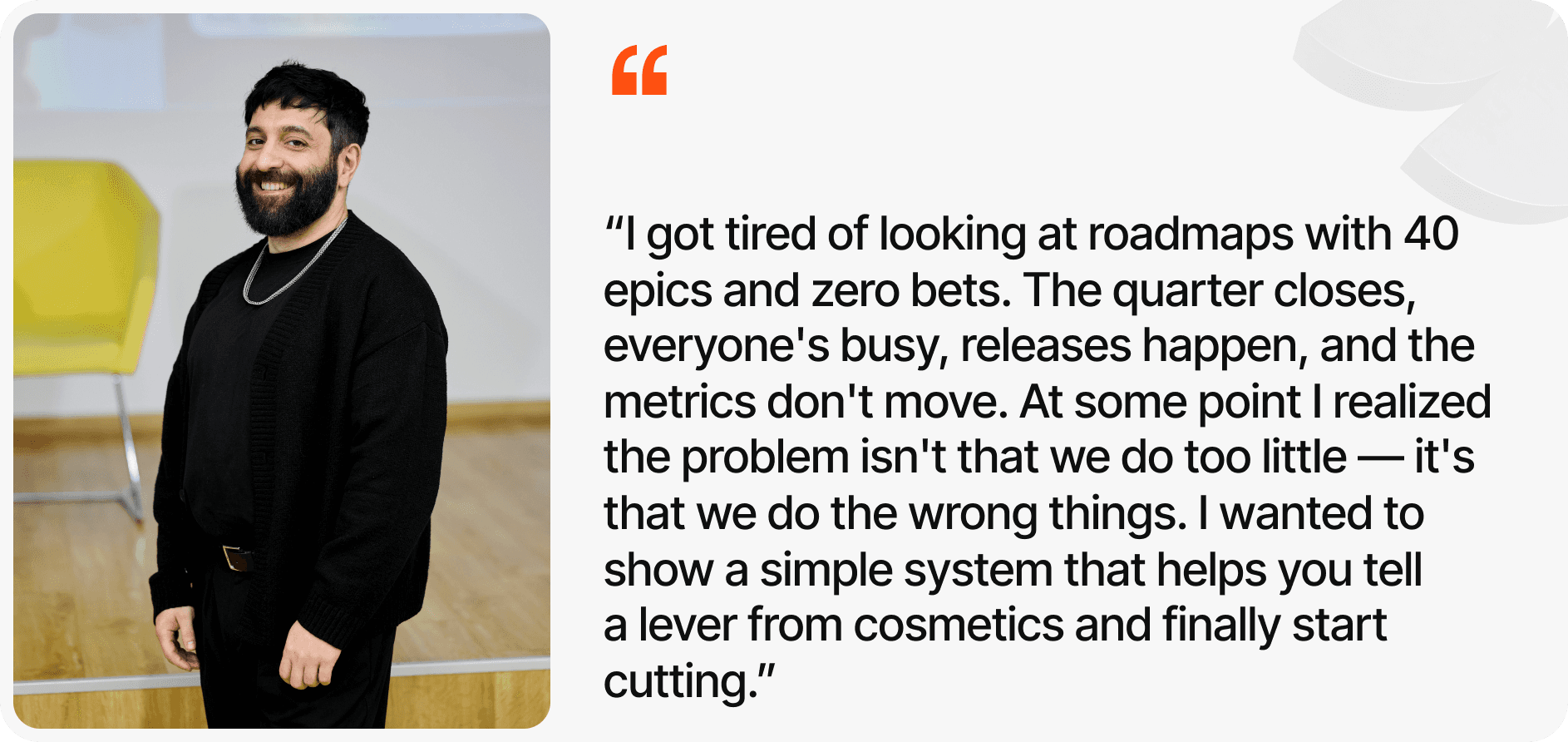 Mykhailo laid out an approach built on unit economics: find the four levers that drive your metrics, benchmark your gap against the market, and frame hypotheses as «X → Y by +Z% → impact on Revenue $». Anything that doesn't hit these levers is noise.