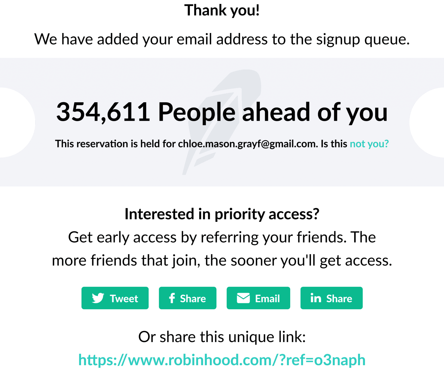 The company amplified a FOMO effect around the app by embedding a gamified referral program. By referring the app to other people, a user earns points and moves up in the list for early access. The more people a user brought to the app, the faster they would get a chance to use Robinhood.