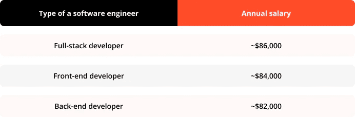 As you can see in the table above, the differences between salaries of these developers isn’t that big. But if you decide to go without a full-stack engineer, you’ll need to fork out for the annual salaries of both front-end and back-end developers (Cha-ching).