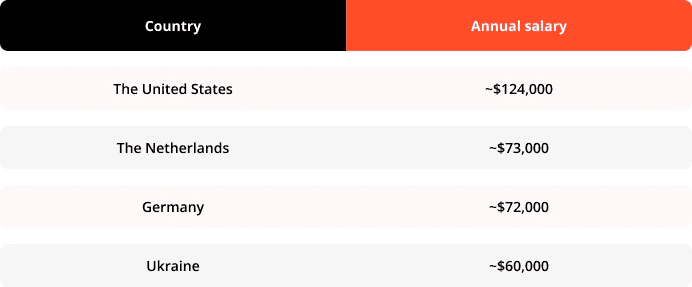The good news is that SaaS engineers’ salaries differ from country to country. If you want to reduce your costs, you should consider outsourcing your project to professionals from the Netherlands or Germany, whose salaries are significantly lower (around $73,000 and $72,000, respectively).